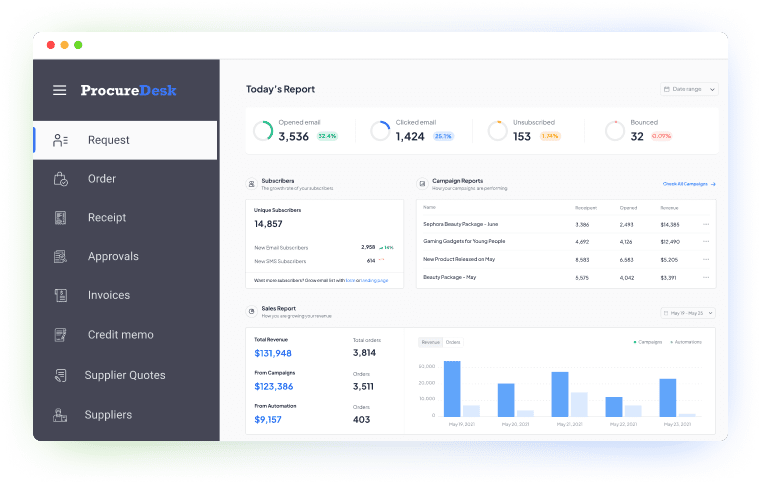 ProcureDesk lets you set budget controls over your procurement process. You can assign budgets to departments, projects, or cost centers. As purchase requests come in, the system automatically checks them against available funds before approval.