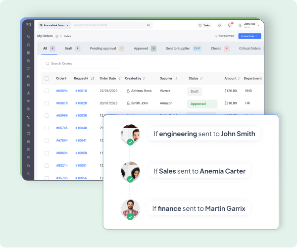 The system follows preset conditions to auto-approve or route requests to the right approvers for review. It can also redirect each request to multiple approvers if needed. This allows you to maintain purchasing compliance without manual workarounds.